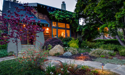 The landscape was planted out with drought tolerant and California native plants in the front yard and parking strip. We installed water-smart irrigation and Forest Floor mulch for water conservation, soil and plant health and aesthetic. Low-voltage LED path lights were installed along the pathway from the sidewalk to the front door.